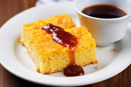 cornbread with bbq sauce on top on a white plate, created with generative ai