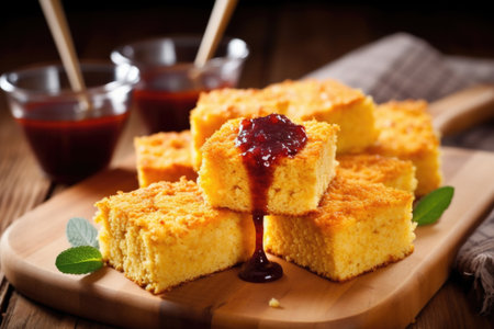 cornbread on board with bbq sauce drizzle, created with generative ai