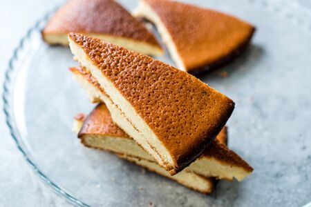 Sponge Cake Slices in Glass Tray. Ready to Serve. Homemade Dessert.