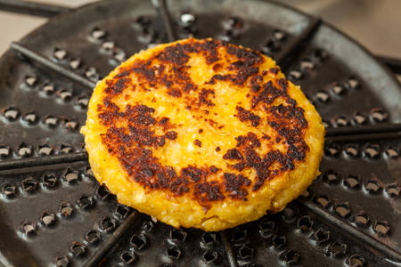 Traditional Colombian Arepa de Choclo Preparation: Corn bread being roasted on a round grill