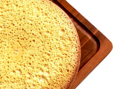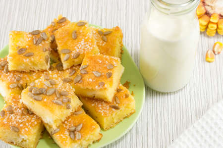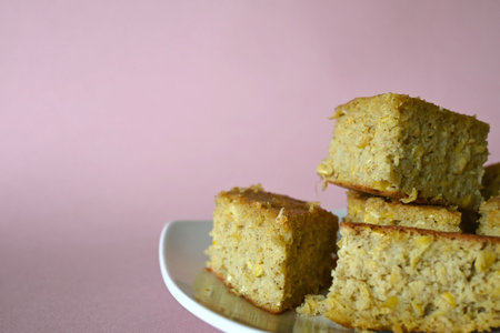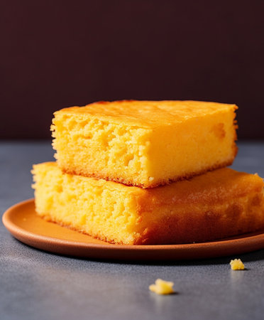 Fluffy cake cornbread on wood plate with blurred background