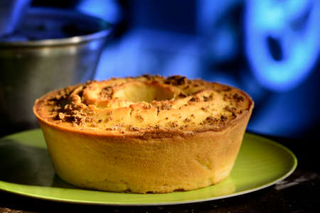 Homemade apple cake on a blue wooden background. Selective focus.