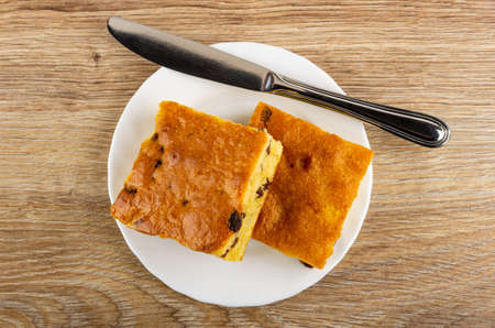 Two biscuit cookies with raisin and table knife in white plate on wooden table. Top view