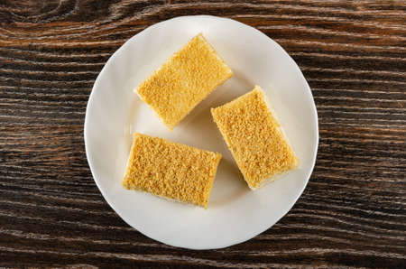 Three pieces of cottage cheese and yogurt cake with shortcrust crumbs in white plate on dark wooden table. Top view