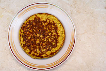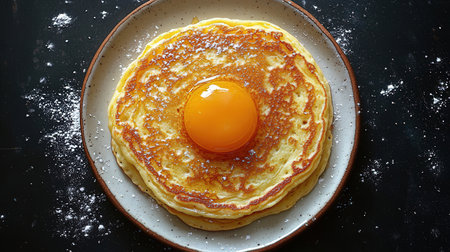 Pancakes with egg yolk on a plate. Top view
