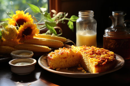 Corn cake without rustic wood slice and fabric with corn, slice in plate and cake, generative AI