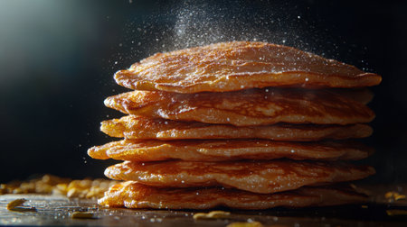Five pancakes stacked high, sugar dust swirling, cinematic light, deep shadows, hyper-detailed texture, ray-traced realism, dark moody background