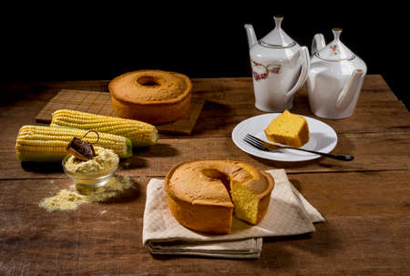 corn cake witout slice on rustic wood and fabric with corn, slice in plate and cake in background.
