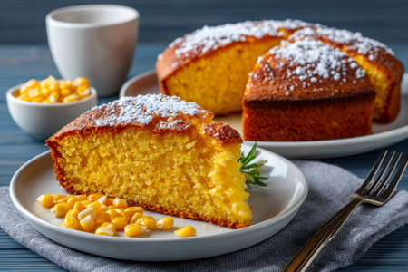 Sweet corn cake and sliced piece with powdered sugar, fresh rosemary, and corn kernels