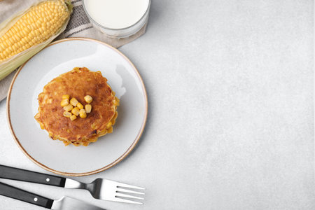 Tasty corn pancakes served on light gray table, flat lay. Space for text