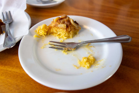 Partially eaten cake on a white plate with fork on table