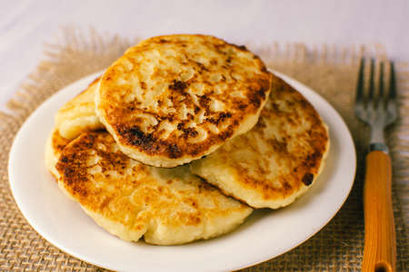 Healthy cheese pancakes sprinkled with powdered sugar prepared with cottage cheese and cooked. Perfect healthy meal for breakfast.Flat lay with copy space.