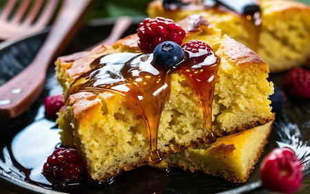 pouring honey over a warm piece of bbq cornbread, created with generative ai