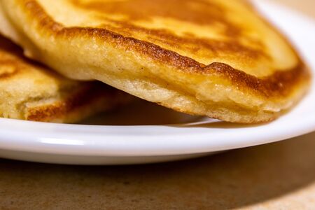 Baked thick brown pancakes on a white plate on the table.