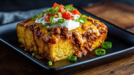 Chili-topped cornbread with cheese, sour cream, and green onions.