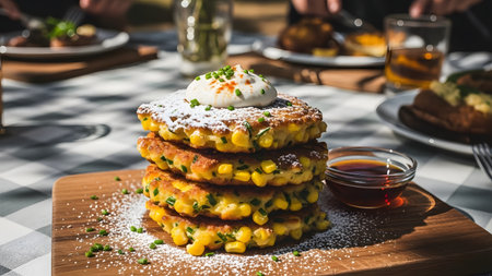 A delicious stack of golden corn fritters topped with sour cream and chopped chives is served on a wooden board. The outdoor picnic setting with sunlight filtering through leaves highlights a tasty vegetarian brunch.