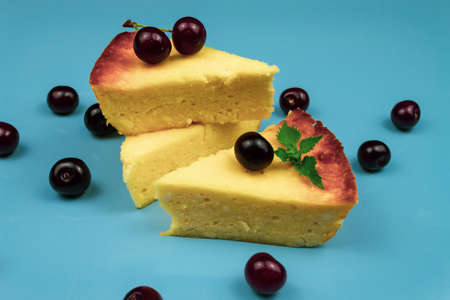 Light breakfast. Three pieces of casserole decorated with mint and cherry. Blue background