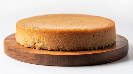 A delicious round cake sits elegantly on a wooden board, showcasing its smooth golden texture. Perfect for dessert lovers, this cake symbolizes culinary artistry.