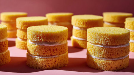 Bright yellow dessert slices layered with cream stand out against a soft pink background, perfect for food photography and sweet treat celebrations.