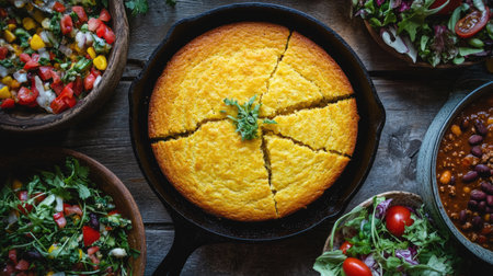 A beautifully baked golden cornbread, sliced and served in a cast-iron skillet, surrounded by vibrant salads and fresh salsas on a rustic wooden table.