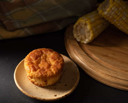 Golden Cornbread Muffin on rustic plate over dark background. Corn cobs. Dark rustic background.