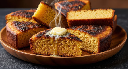 Golden-browned cornbread slices with melting butter on wooden plate