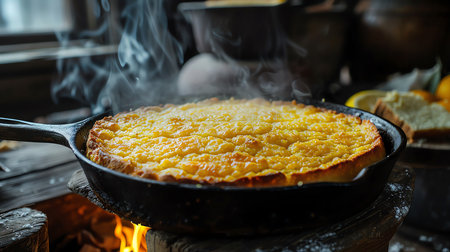 Closeup rustic skillet filled with golden brown cornbread, cooking cast iron griddle atop fireplace; edges bread crispy slightly charred while center fluffy soft.