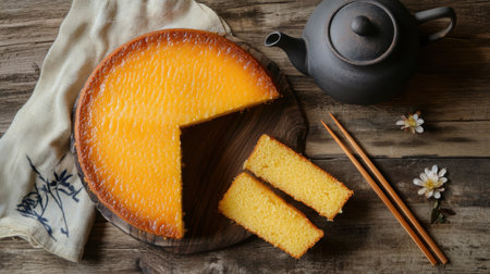 A delightful citrus cake sits on a wooden table, complete with a slice cut out, accompanied by a teapot and chopsticks, creating a warm and inviting atmosphere.