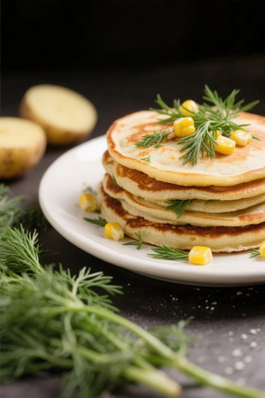 Pancakes with corn and dill on a black background.
