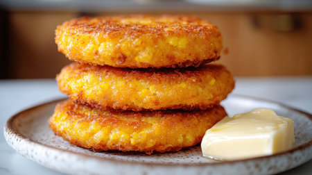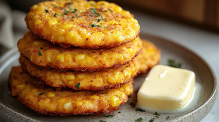 Golden corn fritters piled high on a rustic plate, inviting and savory with butter.