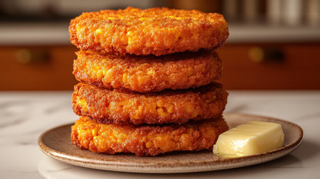 AI Generated. A plate of golden hash brown patties on a wooden kitchen table