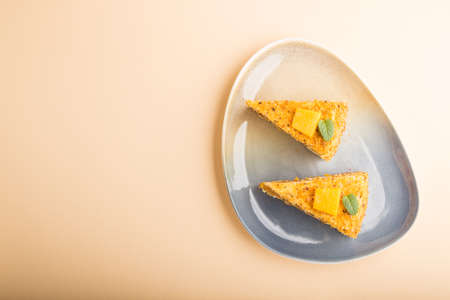 Homemade cake with persimmon and pumpkin on ornge pastel background. top view, flat lay, copy space.