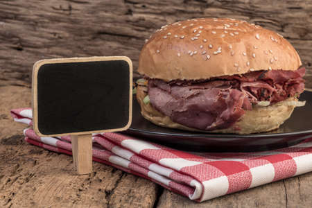 A delicious roast beef burger and an empty chalkboard on wooden table