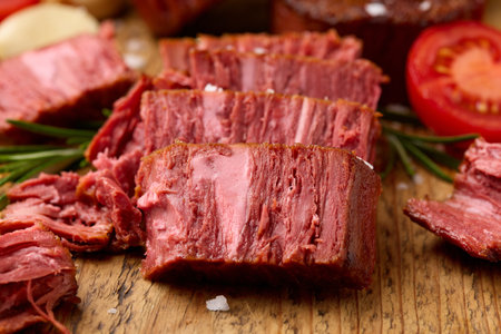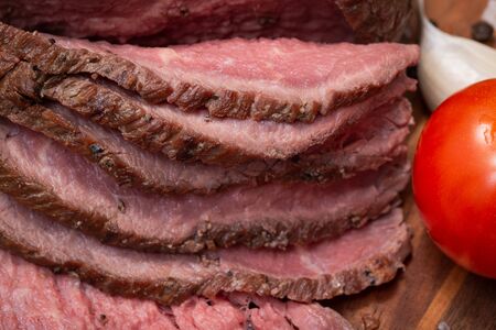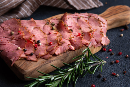 Sliced Grass Fed Juicy Corn Roast Beef on black natural stone background.