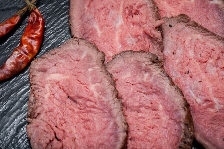 Sliced Grass Fed Juicy Corn Roast Beef garnished with dried Red Chile De Arbol Pepper on black natural stone background.