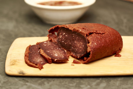 basturma on a wooden cutting board next to a plate with spices. high quality photo