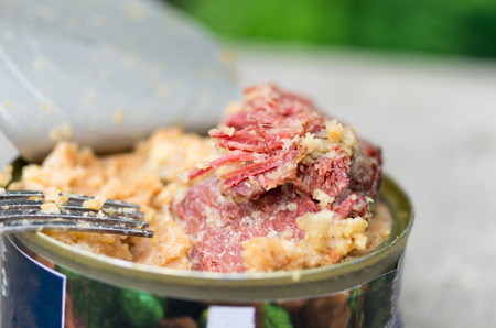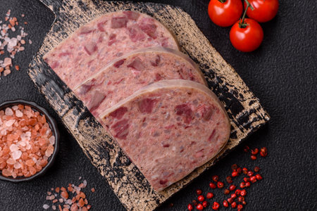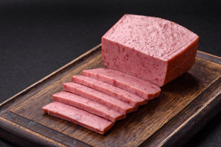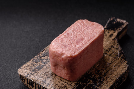Canned ham, meat, pork, with spices and salt, slices on a dark concrete background