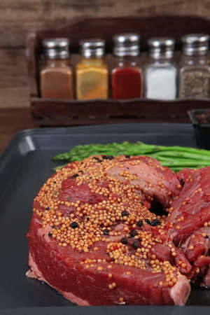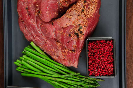 meat raw beef fillet chunk on black tray asparagus on wooden table allspice pink white black green peppercorn stainless cutlery knife fork