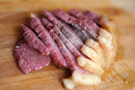 Sliced Grass Fed juicy Corn Roast Beef on natural wood cutting board.