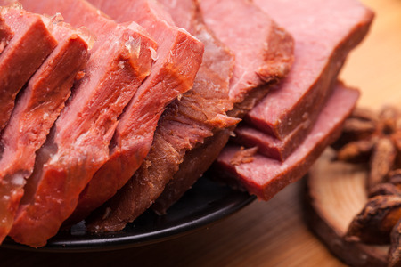Smoked beef meat slices on white plate on dark wooden background. Meat delicacy, sirloin
