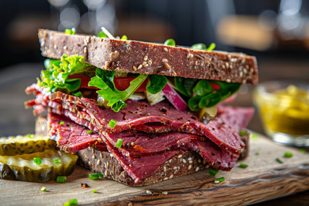Delicious pastrami sandwich with fresh salad, pickle on wood board, tasty wholegrain bread