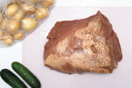 Marinated meat on a cutting board, baby potatoes in a bag and cucumbers.