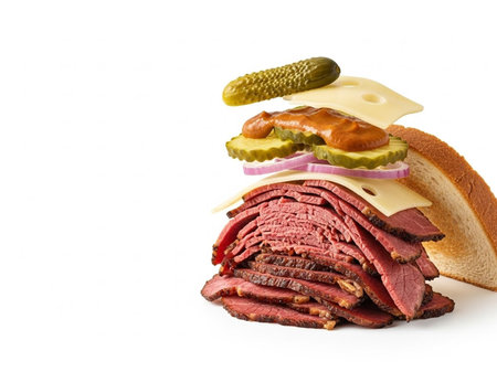 Vectorized corned beef and cheese sandwich on rustic wooden background with ample copy space