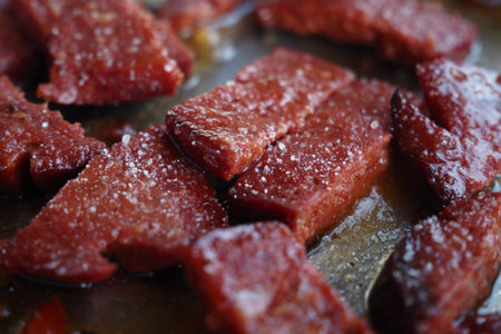 Beef jerky pieces. Sliced pieces of dry meat on a stone floor. close up