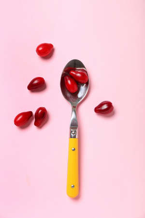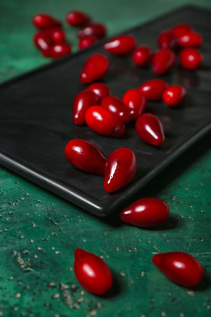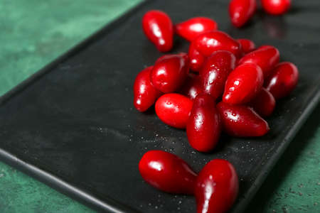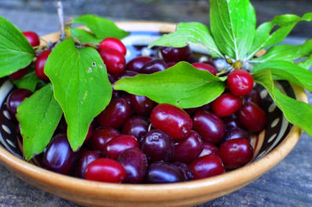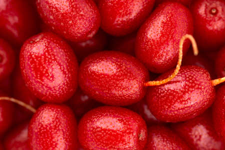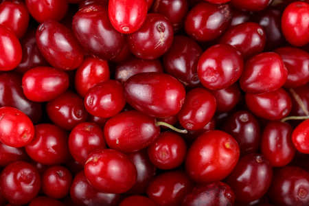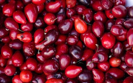 Yellow and red Cornelian cherry dogwood or cornus mas beries. Healthy low carb berry. Pulpy, sweet and sour fruit.