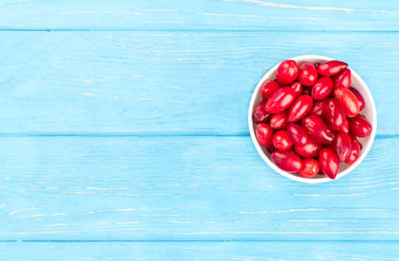 White ceramic bowl filled with cornel on a blank wooden background, top view