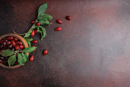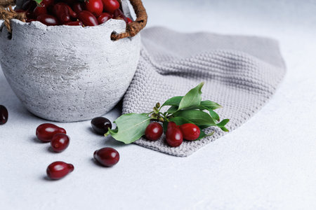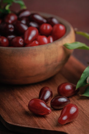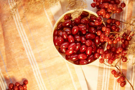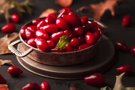 Cornus mas or common red dogwood. autumn wild berries on the branches of a shrub. Natural bright background with bokeh copy space. Harvesting in autumn. Natural vitamins, healthy fruits in soft focus