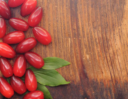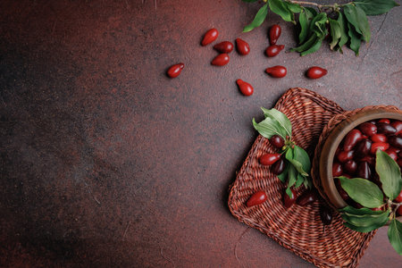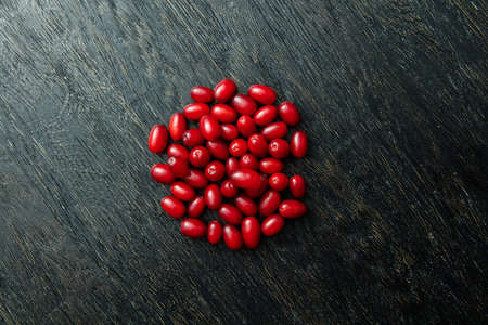 Botanical collection of medicinal plants and herbs, red berries of dogwood or Cornus officinalis tree