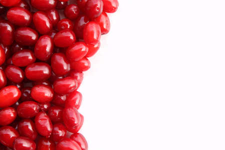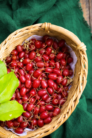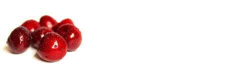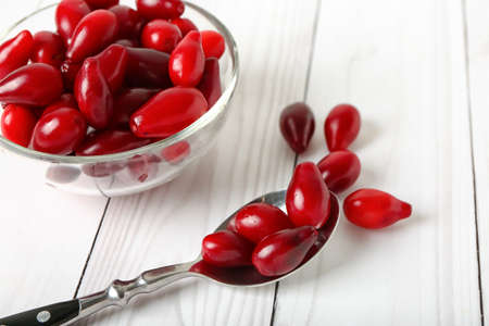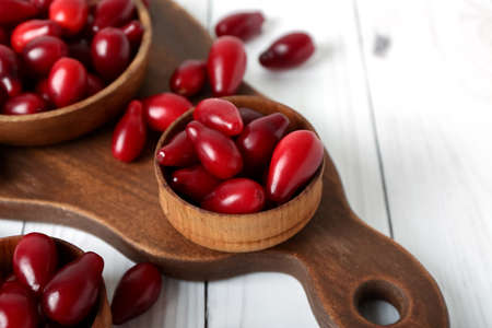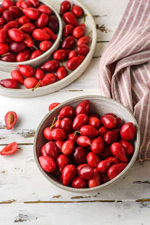 Red berries of a dogwood plant on a white background. Cornus mas. Fruit berries. Harvesting. Agricultural gardening. Healthy eating. Vitamin dessert.