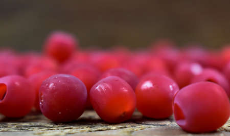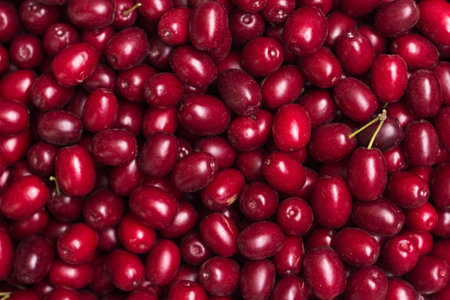 Many ripe burgundy dogwood berries, background. Summer harvested fruits, top view